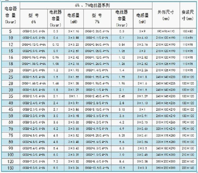 技術參數 (Technical Parameter) 1.適用于電容電壓為0.4KV;0.45KV;0.48KV;0.525KV;0.66KV;0.69KV;6KV;10KV;11KV;12KV; 2.電抗率為:6%;7%;12%;14%等 3.絕緣等級達到F級(155℃);H級(180℃) 4.正常運行時,干式鐵芯電抗器的鐵芯和線圈溫升均不超過90K. 5.過載能力≤1.35倍額定電流下長期運行;噪音≤30dB 提 示:3次、5次、7次諧波一般選用電抗率為6%或7%的;3次諧波較嚴重,請選用電抗率為12%的。選擇不當將造成諧波更為嚴重。