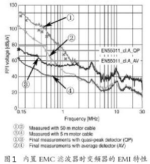 通常情況下,配有內置干擾抑制器件的變頻器的最大運行線纜長度是5 m。帶有內部干擾抑制器件的測試曲線如圖1所示。被測變頻器帶有內部干擾抑制器件,電機線纜長度為5 m或50 m,電機功率為11 kW。在電機線纜長度為50 m的情況下,發生超過限值的情況。測試表明在滿足這些條件下的最大傳導發射滿足EN55011/Class A 的要求。然而,如果變頻器使用更長的線纜,那么電源線上的傳導干擾將會增加,變頻器內置濾波器將不能保證足夠的噪聲抑制。由于屏蔽線纜本身的高寄生電容所產生的共模電流也將隨著線纜長度而增加,這些電流將導致內部濾波器的共模扼流圈飽和,因而EMC 的要求將很難被滿足,配置外置濾波器成為了必要條件。