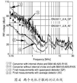 然而,變頻器帶動兩個并聯電機(此例子中是一個功率為7.5 kW和11 kW 的電機),每個電機以25 m長的線纜連接,這種配置要比單個電機、50 m長線纜的配置的要求更高,兩個電機并聯的測試曲線如圖4所示。安裝外置BAOF濾波器,是配有和去掉內置干擾抑制器件的對比測試曲線,將圖2 和圖4進行對比,由圖可知,線纜長為25 m 的兩個電機產生的干擾明顯高于線纜長為50 m的電機。這種現象同樣可以在去掉變頻器內部線圈后的對比測試中重現。如果使用低成本濾波器BAOF,可以實現低于限值的目標,即使在內部線圈被去掉的情況下,但是余量相對于單個電機50 m線纜的情況要明顯小了很多。
