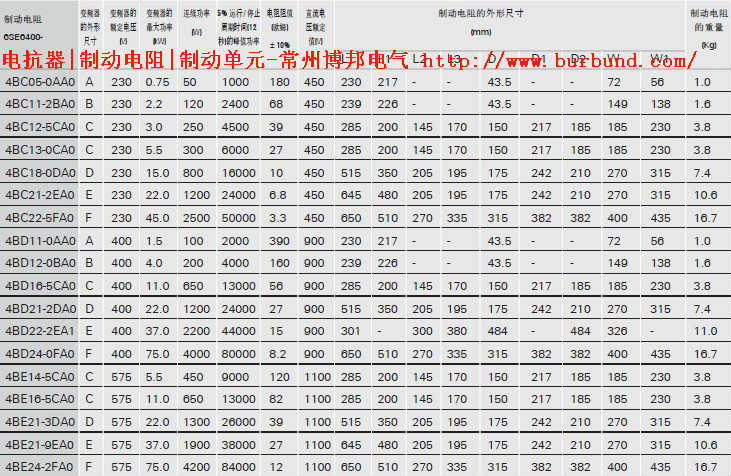 二、西門子制動電阻(鋁殼電阻)的選型 對于外形尺寸為FX 和GX 的MICROMASTER 440 變頻器來說, 可以采用外接的SIMOVERT MASTERDRIVES制動單元及其相應的常州博邦電氣產制動電阻(鋁殼電阻)。