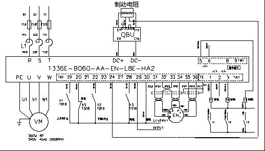 四、控制應用要點 (1) 重載起動和停車 中間包為重型設備, 其負載變化范圍是相當大,其自重近30t ,再加上鋼水可達80t 。1336E系列變頻器是目前最先進變頻控制設備,對電機參數具有自整定優化運行功能,制動電阻能充分發揮電動機潛能,達到最優控制。 升降控制,制動電阻起動尤為重要,變頻器運行后,提升力矩不足話一旦制動單元打開就會出現溜鉤或鋼包滑落無法控制而快速下降,造成設備損壞事故。停車時,速度和制動單元配合不好,也會出現過早制動造成制動單元壽命縮短。解決方案:見原理圖2