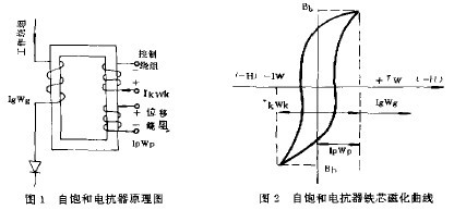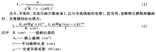 3 自飽和電抗器的工作原理 自飽和電抗器是磁化電抗器的一個分支,是磁放大器的一種類型。磁放大器的作用原理是基于直流磁化時.其鐵心上的導磁率 ( —B/H)要發生變化,當交流繞組(工作繞組)的電阻為R~,電感為I 時.交流回路的電流I~可用下式表達。