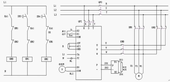 (冷鐓機變頻調速系統原理圖) 調速電位器(R)接至變頻器的外部給定調節輸入點(10V、AI1、AGND),調節變頻器的輸出頻率在0~50Hz范圍內改變,從而實現對變頻電機的無級調速;將控制柜面板上的數顯表接至變頻器的輸出頻率點(DO、COM),在數顯表上動態顯示電機的轉速;將報警燈接至變頻器的繼電器輸出點(TA,TC),當變頻器工作異常時報警。