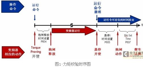(1)溜鉤保護 當(dāng)負載移動停止,機械抱閘閉合,變頻器將斜坡降低輸出轉(zhuǎn)矩,同時監(jiān)測編碼器反饋,確認負載被控制。如果監(jiān)測到編碼器反饋有變化(溜鉤),變頻器會馬上增加輸出轉(zhuǎn)矩,重新控制負載,按照預(yù)先設(shè)定的速度下放負載。變頻器會重復(fù)以上的周期,直到抱閘能控制負載或負載安全下放到地面。 (2)速度偏離保護(失速保護) 變頻器會連續(xù)的監(jiān)測速度命令和速度反饋,比較其偏差,如果偏差超出所允許的范圍,那么變頻器將變?yōu)楣收蠣顟B(tài),同時,抱閘投入工作。 (3)輸出缺相保護 三相輸出接線端被監(jiān)測,確保輸出每有缺相。一旦TorqProve 使能,這項功能不能被屏閉。 (4)編碼器丟失 變頻器會連續(xù)的監(jiān)測編碼器反饋,確保編碼器工作正常。只要出現(xiàn)編碼器丟失變頻器馬上變?yōu)楣收蠣顟B(tài),同時,抱閘投入工作。一旦TorqProve使能,這項功能必需使能. (5)基于負載大小的速度限制 允許高于基速運行(輕載時更快運行);在基速時測量負載大小,若低于額定負載,則可超速。PowerFlex 700S變頻器的力矩校驗時序圖如圖1所示。