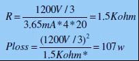 R選擇為3.5Kohm:則均壓制動電阻電流為電容漏電流的8倍,串聯電阻均壓之后電容上電壓最大值為445V, R上損耗46w。 |