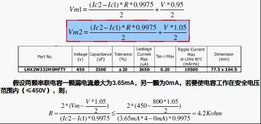 若只考慮容量公差,則對于容量公差為±20%的電容來說,以下應用就已經有過壓的危險。Vbus=1200V, 三個450V/3300uF電容(容量公差±20%)串聯應用。
