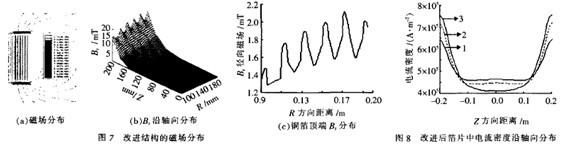 二、空心箔式電抗器降低功耗的結構改進 為了驗證這個思路的有效性.對該結構進行了仿真分析。圖7(a)為磁場分布圖,圖7(b),(c)表明,此時電抗器中的徑向磁場顯著減小,峰值只是空心結構時的1/3左右。各箔片中電流密度分布見圖8.比較圖8和圖2可知.改進后箔片中電流密度均勻性比空心時的要好。對該結構計算出的交流損耗P5=34.329 W,比空心結構時的交流損耗降低16.7%。與直流損耗之比為:K =尸5/Po=34.329/32. 7=1.058。