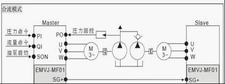臺達雙泵合流驅動產品通過伺服控制器的485總線實現對分系統的協調控制,用合流后的壓力作為壓力反饋。上位機的給定壓力和流量命令信號接入主泵(控制器),主泵通過485總線將數字命令傳輸給從泵,合流控制中的各個伺服控制器根據應用需求確定最節能的工作狀態,協同控制各電機的力矩和轉速,確保系統壓力和流量的快速響應,壓力和流量的穩定,以及制成過程中的平穩轉換。