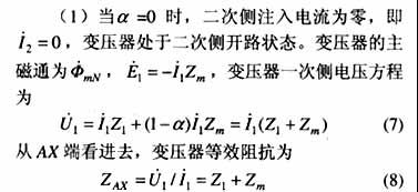 從式(5)可知,由AX端看進去,變壓器呈現的阻抗為一可變量,其大小與a 滿足一定比例關系。因此通過調節a 的大小,可改變變壓器二次側的磁勢,從而改變了變壓器鐵心中的主磁通,變壓器的一次側也會呈現一無級可調阻抗。該原理可用于現行的很多FACTS(柔性輸電系統)裝置和消弧線圈中,例如:在UPFC(統一潮流控制器)[5]和TCSC(晶閘管控制串聯電容器)[3]中,只須連續改變系統阻抗便可以控制線路潮流;在FCL(故障電流限制器)中,正常運行時令a =1,可調電抗器呈現很小的一次側漏阻抗,對系統基本沒有影響,當出現故障時,通過一定控制立即令a =0,該可調電抗器為勵磁阻抗,從而將故障電流限制在一定范圍內;這些都可以根據該基于磁通可控的可調電抗器新原理來實現。因本方案通過變壓器的主磁通往下調且帶有空氣隙,因此該可調電抗器沒有飽和現象,而且在實現阻抗連續可調時不產生任何諧波。 3 磁通可控變壓器的兩種特殊情況