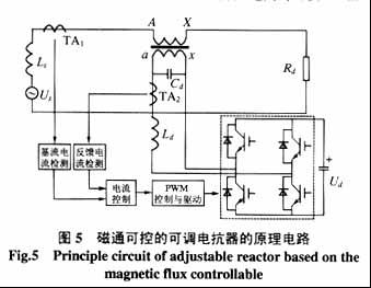 4 實驗電路結構及控制方式 為了證明上述原理的正確性,本文設計了一套基于磁通可控的可調電抗器原理電路如圖5,一串聯變壓器的一次側AX串聯接在電力系統和一阻性負載Rd之間,Us為電網的電壓,Ls為電力系統的等效內阻。變壓器的二次側ax和一個電壓型逆變器接在一起,此逆變器用于產生一個磁通補償電流。Ud 為逆變器的直流側電壓,Ld 和 Cd用于抑制逆變器產生的高頻紋波。檢測電路和整個控制電路用于產生一個與變壓器一次側電流頻率相同,相位相反的補償電流。
