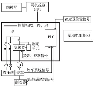 1、系統由5臺設備及外圍自動化元件構成(見圖1),其中控制柜4臺、司機操作臺1臺。P1為司機操作臺,負責司機操作及觀察;P2為PLC控制柜,負責系統控制、保護等工作;P3為變頻器柜,安裝變頻器;P4為電源及制動單元柜,安裝接觸器、空開、制動單元、電抗器等;P5安裝制動電阻;外圍自動化元件:外圍的傳感器、變送器、接近開關、限位開關等。
