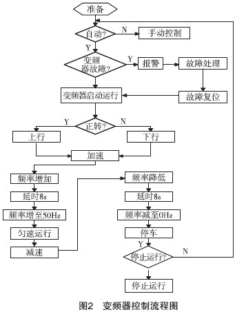 系統配有電壓變送器、電流變送器、油溫變送器、油壓變送器、制動器閘瓦開關及測量纜車運行速度和運行位置的編碼器,以將相關參數采集傳送至PLC內進行運算、處理,以便進行相應控制、保護。變送器均采用防塵、防水、防腐蝕的全密封機構,防護等級IP66。各種機構均設有工作及緊急限位保護,以充分保證系統的安全運行。 六、變頻控制柜(P3)的主要功能 變頻控制柜實現對提升機電力拖動功能,變頻器運行主要由PLC進行控制。變頻采用日本安川G7系列3電平變頻器,用戶不用考慮更換電機,減少改造的成本,該系列變頻器具有轉矩限制功能、可進行矢量控制、支持四象限運行(主要用于起重設備)。安川G7系列3電平變頻器特點:① 降低對電動機端子的沖擊電壓:不需要使用解決沖擊電壓的外選附件,可用于一般電機(包括繞線電機);②降低高頻漏電流:減少接地檢測器的誤動作;③ 降低EMI,可使干擾濾波器小型化、簡單化;④ 解決了軸承電流腐蝕問題,提高了軸承的使用壽命。控制流程如圖2所示。