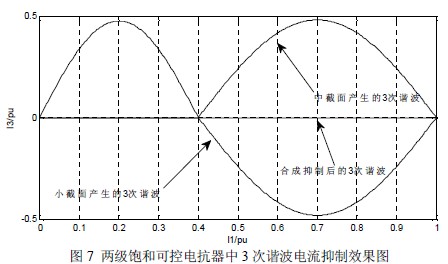 圖7為在該設計條件下的3 次諧波抑制效果圖,可見當中截面進入飽和工作區后,電抗 器輸出電流中3次諧波含量大大減小不到1%,這是因為小截面產生的3次諧波電流與中截面產生的3次諧波電流相位相反,互相抵消。圖8為單級飽和可控電抗器與兩級飽和可控電抗器總諧波含量的比較,可見雙級飽和可控電抗器的總諧波含量明顯低于單級飽和可控電抗器。