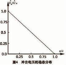 在工頻電壓作用下,雜散電容所表現出來的阻抗遠遠大于繞組的感抗和電阻,這時起主導作用的是電感,電容可以忽略不計。但在沖擊波的作用下,由于沖擊波的波頭跳變過程無線短,相當于瞬間頻率無限大,這時等值電路內的感抗值將大大超過相應的雜散電容的感抗值,因此等值電路圖可以簡化成電抗和電阻相當于開路狀態。 4.空心電抗器繞組的穩態分布 相對沖擊波的波頭而言,沖擊波的波尾部分變化比較緩慢,達到穩定值的直角波實際上是一個直流電壓,這時起主導作用的僵尸繞組的電阻,電壓沿繞組的分布就只由繞組的電阻決定,分布曲線如圖4。