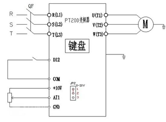 電氣接線圖參數(shù)設(shè)置,利用變頻器多功能輸入端子DI2設(shè)置正轉(zhuǎn),模擬量輸入端子AI1調(diào)節(jié)頻率。
