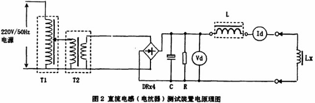 二、直流電感或電抗器測試設備 直流電抗測試設備,是在交流測試設備的基礎上,將交流整流后得到直流輸出,原理圖如圖2: