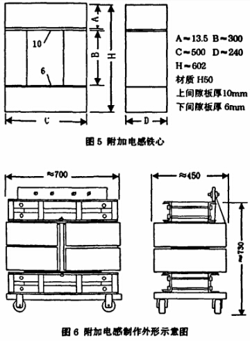 研究與開發(fā)完成的附加電感,每組線圈的直流電阻約200mΩ,2組線圈串聯不加電流時電感約為897mH(實測值910mH),在150A電流下應有280mH的電感(估算值);2組線圈并聯時直流電組約100mΩ,不加電流時電感約227mH(實測值258mH),在300A電流下應有75mH的電感(估算值)。