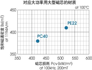其最初的成果見上圖所示的開發過程,是為響應開關電源的最尖端需求而著手的PC40至PC47。現在,這一系列的磁芯損耗已達到大約40%以下的250kW/m3,飽和磁通密度也達到超過高飽和磁通密度材料PE22的420mT。