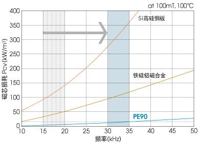 在支持大功率用大型磁芯的鐵氧體類別上,高飽和磁通密度為430mT,迫近以擁有行業最高水平的飽和磁通密度為榮的PC33的飽和磁通密度到達點; 同時磁芯損耗僅為400Kw/m3,低于低損耗材料PC40。尤其是降低磁芯損耗23%,這一成果為串聯電抗器與進線電抗器設計賦予了前所未有的富裕度,是一個巨大的飛躍。