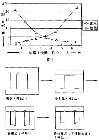 設(shè)計者必須考慮的問題是小型化及提高功效。對現(xiàn)有的電抗器部品進行設(shè)計改良,鐵心是電抗器設(shè)計中最主要部件之一。我們通過多種方案和實驗,選擇最優(yōu)化的設(shè)計方案,同時選擇滿足的電器性能的材料。一臺性價比好的電抗器,既要考慮成本,又要考慮性能,找出兩者結(jié)合點是我們設(shè)計首先考慮的問題。在圖3中,可看“4”是最佳點。