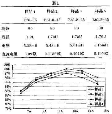 以上是通過改善鐵心的結(jié)構(gòu)來到達電抗器的特性,下面我們就通過試驗電氣特性和溫升來驗證。圖6是效率和電流的曲線,可見樣品4效率很高的。圖7是電壓和電流的曲線,可見樣品4負載特性是很好的。圖8是電感和電流的曲線,可見樣品電抗特性也是不錯的。圖9是溫升和負荷電流的曲線,樣品4的溫升特性是不錯的。