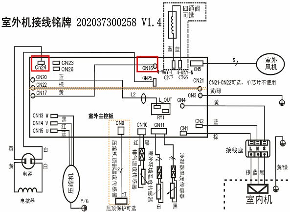 上圖紅色方框中兩個單插片CN24、CN25即為單電抗器和交流電容的接線端子。在電控板上印有漢字絲印,分別為黃、白,與對應(yīng)強電連接線組(連接電抗器和交流電容的連接線)的顏色對應(yīng)。 2、單電抗器方案接線圖: