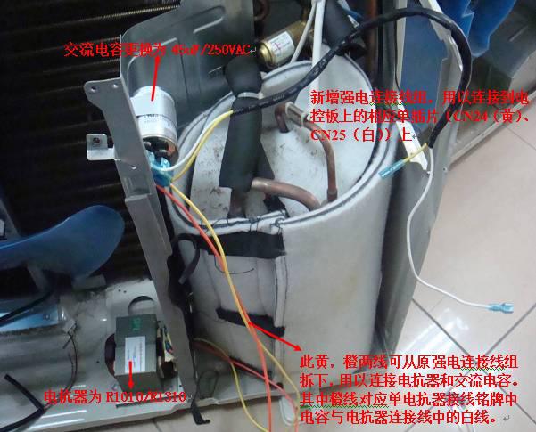 2、新增:KFR-26W/BP2-110.D.XZ.QDXZ-3(1.0) 的強電連接線組(物料編碼:202437300174),用它與原先連接雙電抗和交流電容的原有連接線組將換好的R8525L電抗器和6uF/450VAC交流電容依照單電抗器方案的室外機接線銘牌接到電控板上。