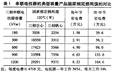 2.損耗 鐵心串聯電抗器比空心串聯電抗器在低損耗方面有較大的優勢。例如常規產品鐵心串聯電抗器的損耗只是同容量空心串聯電抗器損耗的1/3左右。表1為一些串聯電抗器的典型容量產品國家規定損耗值的對比。