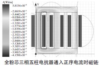 3、三相五柱磁路仿真 使用Maxwell 對三相五柱電抗器進行建模仿真。當電抗器的磁芯都是由鐵硅粉芯組成時,其磁鏈分布如圖4所示。由圖4可以看出,在鐵芯柱與鐵芯軛的接縫處存在較多的旁路磁通,而且這些旁路磁通有一部分直接與繞組鋁箔相交,這些磁鏈會在鋁箔內形成電阻很小的渦流,引起很大的線圈損耗。為減小旁路磁通的影響,將上下顎換成B23P090 取向硅鋼片,對其進行仿真,其磁鏈分布如圖5 所示。由圖可見,即使在電抗器繞組中通入零序電流,氣隙處的旁路磁通依然很小,減小旁路磁通引起附加損耗的同時減少了電抗器的漏磁,防止對周邊的器件產生電磁干擾。