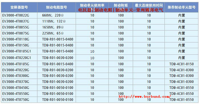 常州博邦電氣專業生產艾默生變頻器用制動單元和制動電阻,EV3000-4T0022G~EV3000-4T0150G、EV3000-4T0185G1、EV3000-4T0220G1 變頻器已經內置制動單元,需要能耗制動時用戶只需要外配制動電阻。EV3000-4T0185G~EV3000-4T2200G 變頻器無內置制動單元,需要能耗制動時用戶需要外配制動單元和制動電阻。